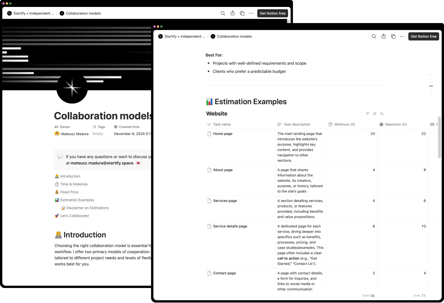 A comprehensive overview of collaboration principles, estimation structure, and project workflow is available in a structured Notion workspace.